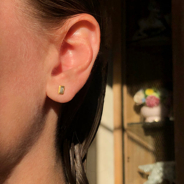 Grey baguette diamond studs Shannon Carney Jewelry $ 425.00 Default Title - $ 425.00 Quantity This product is currently sold out. Please fill in the form below if you'd like to be notified when it becomes available. Product details: Ready to ship Faceted grey baguette diamonds bezel set in 18k yellow gold 14k posts with gold-filled backs Each stud is approximately 5mm x 3mm Handmade in my studio