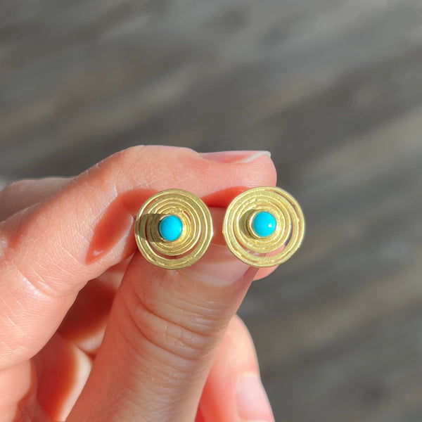 Small spiral & turquoise earrings Shannon Carney Jewelry $ 0.00 Default Title - $ 0.00 Quantity This product is currently sold out. Please fill in the form below if you'd like to be notified when it becomes available. Product details: 18k solid yellow gold, hammered Each earring is approximately 1/2" (13 mm) in diameter Round turquoise cabochon stone set with a yellow gold bezel in the center of each earring 14k posts with gold-filled backs Handmade in my studio Ready to ship