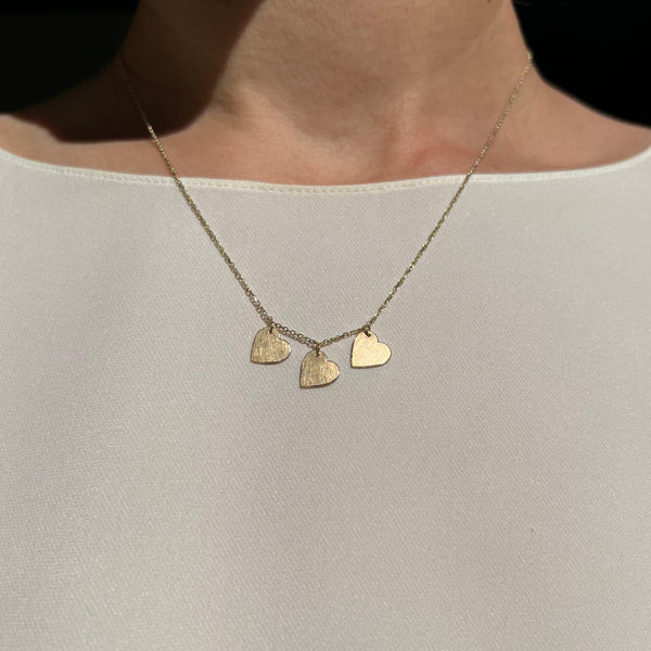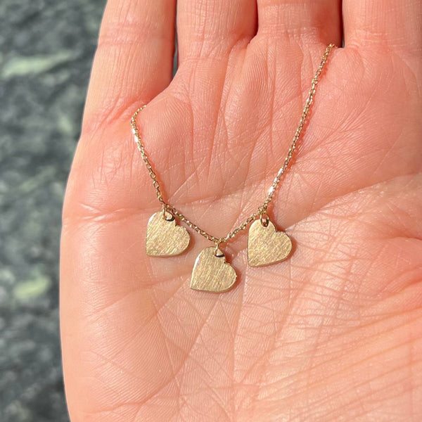 - Three 14k solid gold hearts hung askew on 14k diamond-cut gold chain, with a 14k solid gold handmade clasp